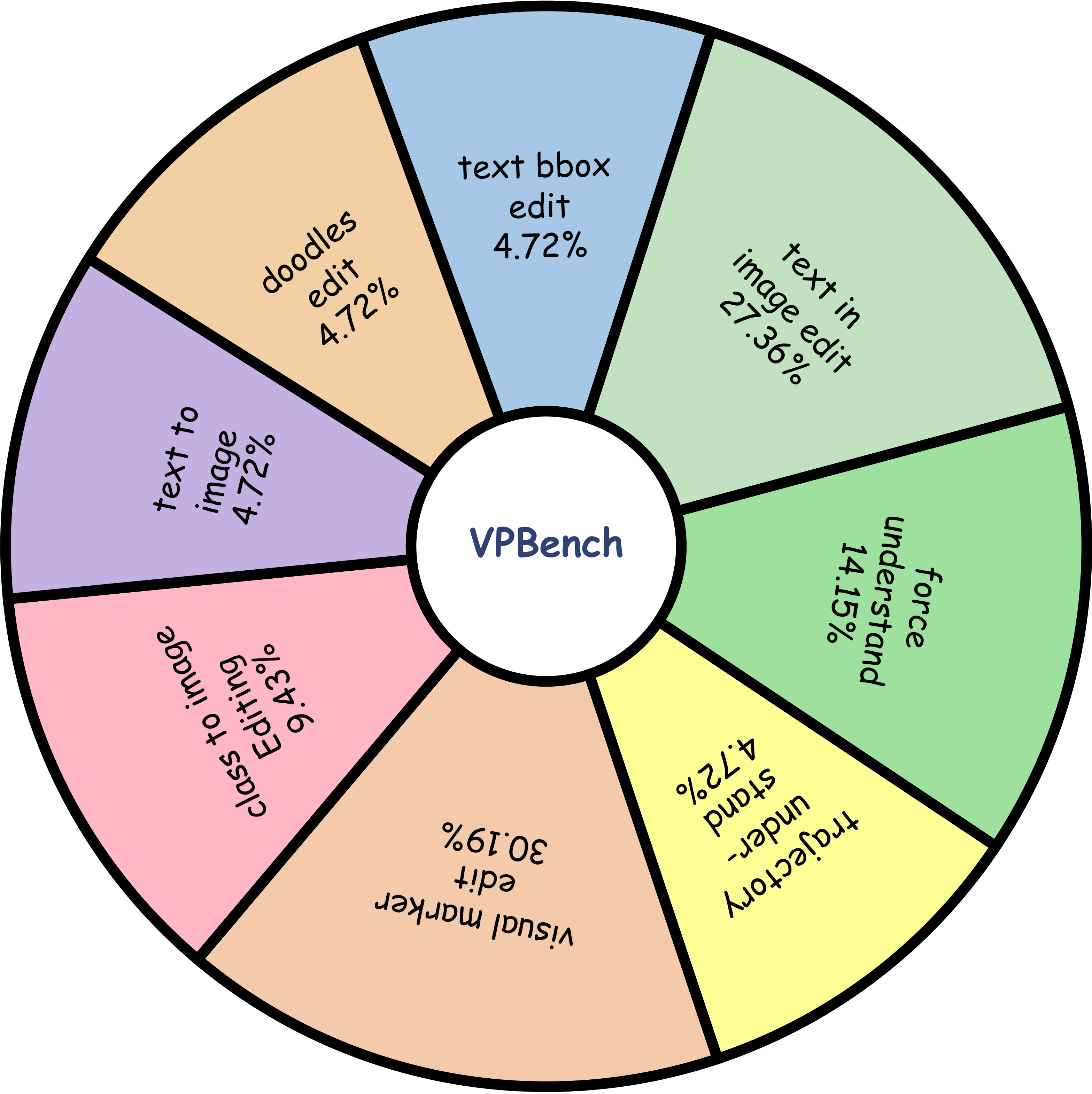 VisPrompt is a comprehensive dataset that comprises eight distinct data types, including class-to-image generation, text-to-image generation, text-in-image editing, text bounding box editing, visual marker editing, doodles editing, force understanding, and trajectory understanding. The dataset covers a wide spectrum of image-to-image generation, ranging from basic text-in-image generation to compositional editing, and further to physics-aware instruction following.