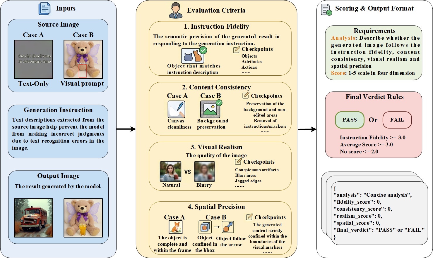 We evaluate visual instruction following using a VLM-based pipeline, which takes three inputs: the source image (Case A: text-only canvas; Case B: annotated real images), the generated output, and the text instruction extracted directly from the source image. This explicitly provided text prevents evaluation errors that could occur if the evaluating VLM fails to accurately understand the instruction from the visual input. Each sample is evaluated on a 1-to-5 scale across four criteria—instruction fidelity, content consistency, visual realism, and spatial precision—yielding a final outcome of PASS or FAIL.