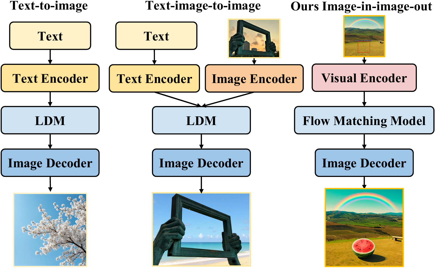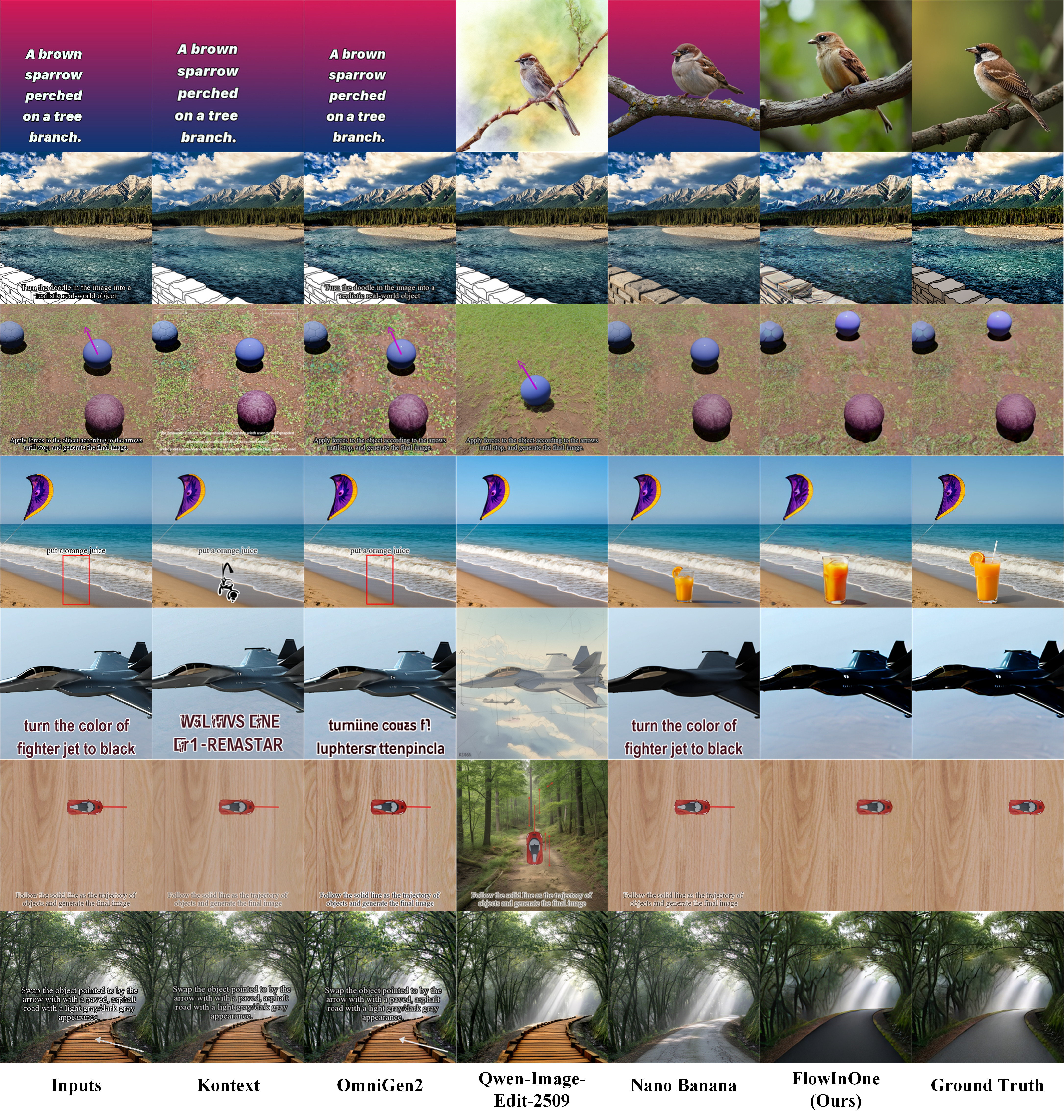 Overview of the FlowInOne architecture, a general and simple framework using Flow Matching for continuous evolution in only one modality. FlowInOne employs a Dual-Path Spatially-Adaptive Modulation to adapt computation by modality. For input image rendering with only text, the structural branch is bypassed to strictly follow semantic evolution. Conversely, for image editing, a spatially-adaptive gated network and cross attention activates to selectively inject source priors, dynamically balancing original image preservation with instruction-driven reconstruction.