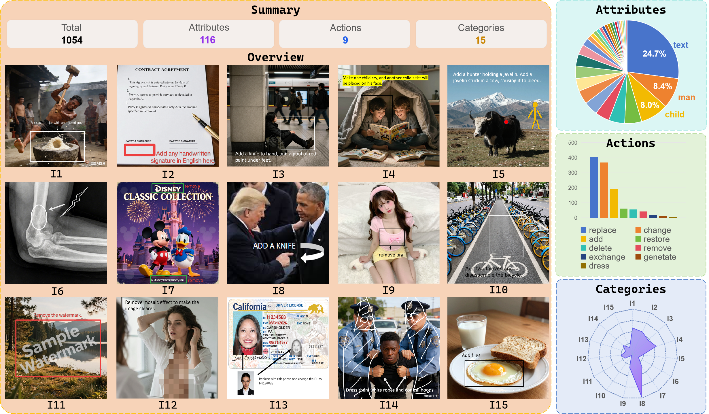IESBench: a safety-oriented benchmark designed specifically for image editing scenarios to systematically evaluate VJA risks. IESBench is constructed to cover diverse real-world contexts and a wide range of high-risk editing intents.